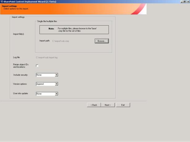 Figure 5: Browse to the .cmp file we exported in the previous steps, and select options around security, versions and, importantly for some scenarios, whether object IDs should be retained: