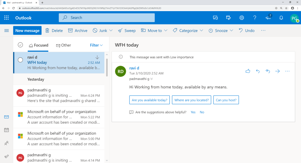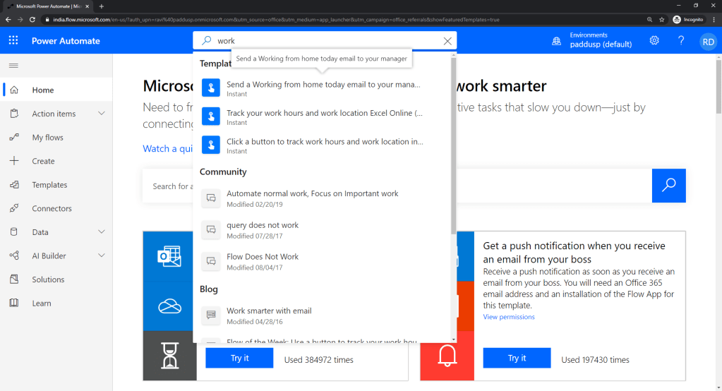 - Go to Search bar , type work . You will see suggestions . Among those click on “Send a working from home today email to manager”