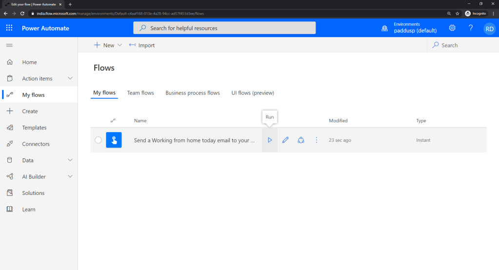 - If we Run this program in Desktop/PC , GoTo “My Flows” , click on Run button –> Continue –> Run flow