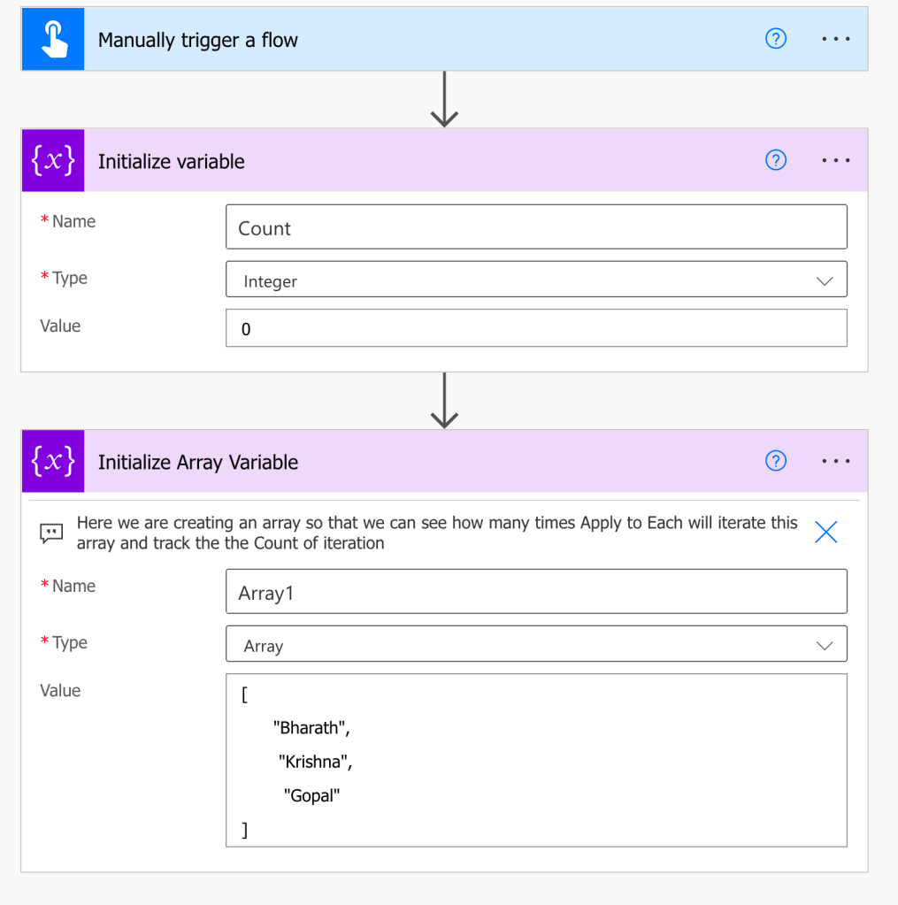 Step-3: Create an Array variable with name: “Array1” = [“Bharath”,”Krishna”,”Gopal”]