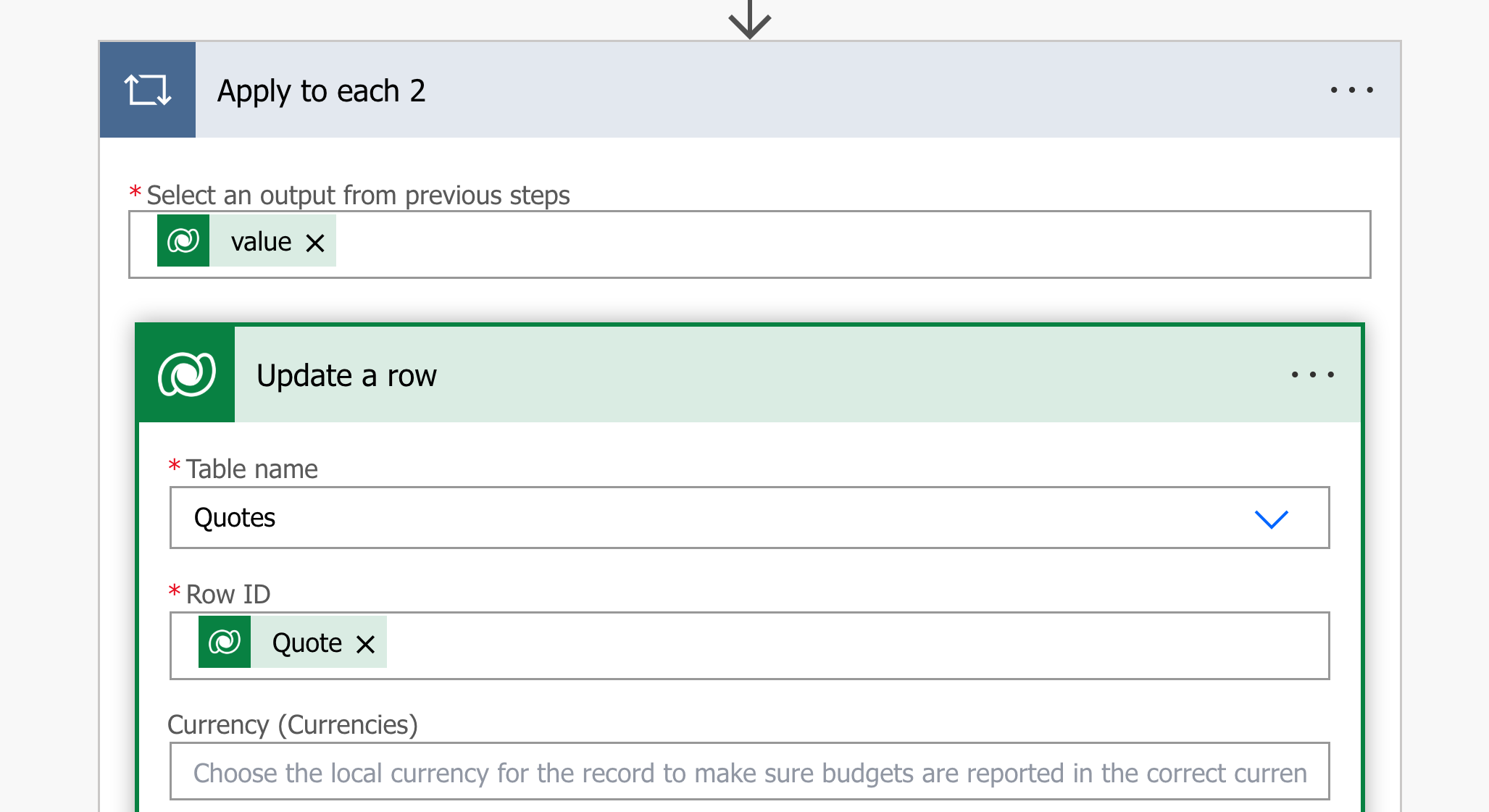 6. Now add List rows 2 and find all items with filter rows as statecode eq 1. 7. Now again apply to each on this List rows 2. Here add update a row. In that give table name and RowID as Quote indentifier. So in status select Closed.
