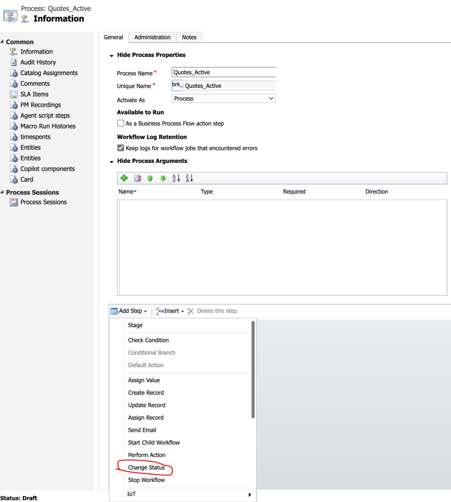 Here Click Add step and select “Chage Status”. It will show that “Change record status to: Quote (table name) and select here in Active–>In progress.